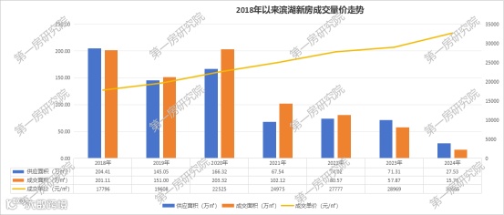 新房市场方面,2018年到2022年这三年滨湖市场成交量较为火热,基本上供不应求,2021年受土地供应减少,市场成交量下滑。从成交价格来看,滨湖区新房价格一直上涨,2020年区域价格破2万/㎡,2024年价格破3万/㎡,近六年新房每年价格都上涨几千元每平方,从2018年到现在,滨湖区新房价格上涨了14870元/㎡,涨幅超过8成。