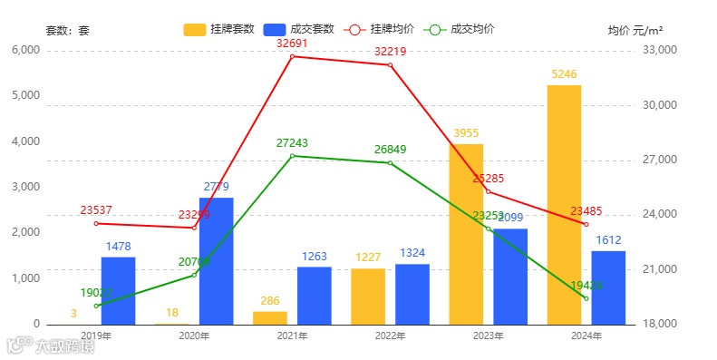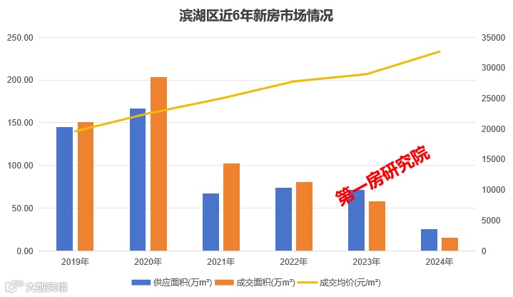 说市场,整个滨湖区二手房价格,2021年成交价格涨到2.7万/m²,随后2022年小幅度的下降,均价2.68万元/m²。然后就是两年的下跌,现在均价只有1.9万/m²。2024年的价格相当于回到了2019年的价格。