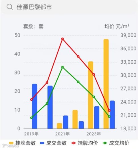首先来看下佳源巴黎都市,2021年高峰期的时候二手房挂牌均价约3.8万/㎡,成交均价约3.18万/㎡。而2024年截至目前,整体挂牌价跌到了约2.2万/㎡,成交均价约2万/㎡。按成交价来看,3年跌了接近12000元/㎡。同时,这个小区对比三年前议价空间再进一步缩小,说明这个楼盘已经快跌到极限了。
