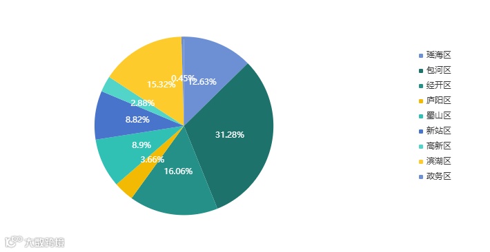 分区域来看,包河区成交面积占比31.28%,九区排名第一。经开区成交面积占比16.06%,排名第二。瑶海区成交面积占比12.63%,排名第三。