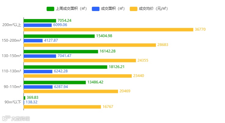 从成交面积段来看,本周成交面积段90-110m²以上的占比最大。