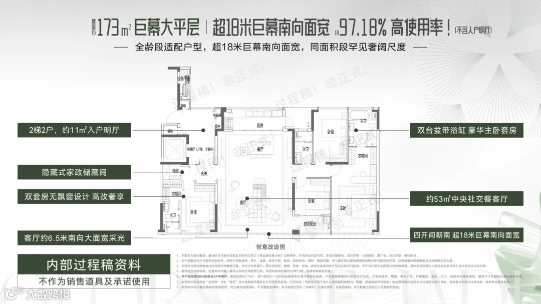 不含入户明厅使用率约97.18%,超18米巨幕南向面宽,这是同面积段罕见奢阔尺度。
