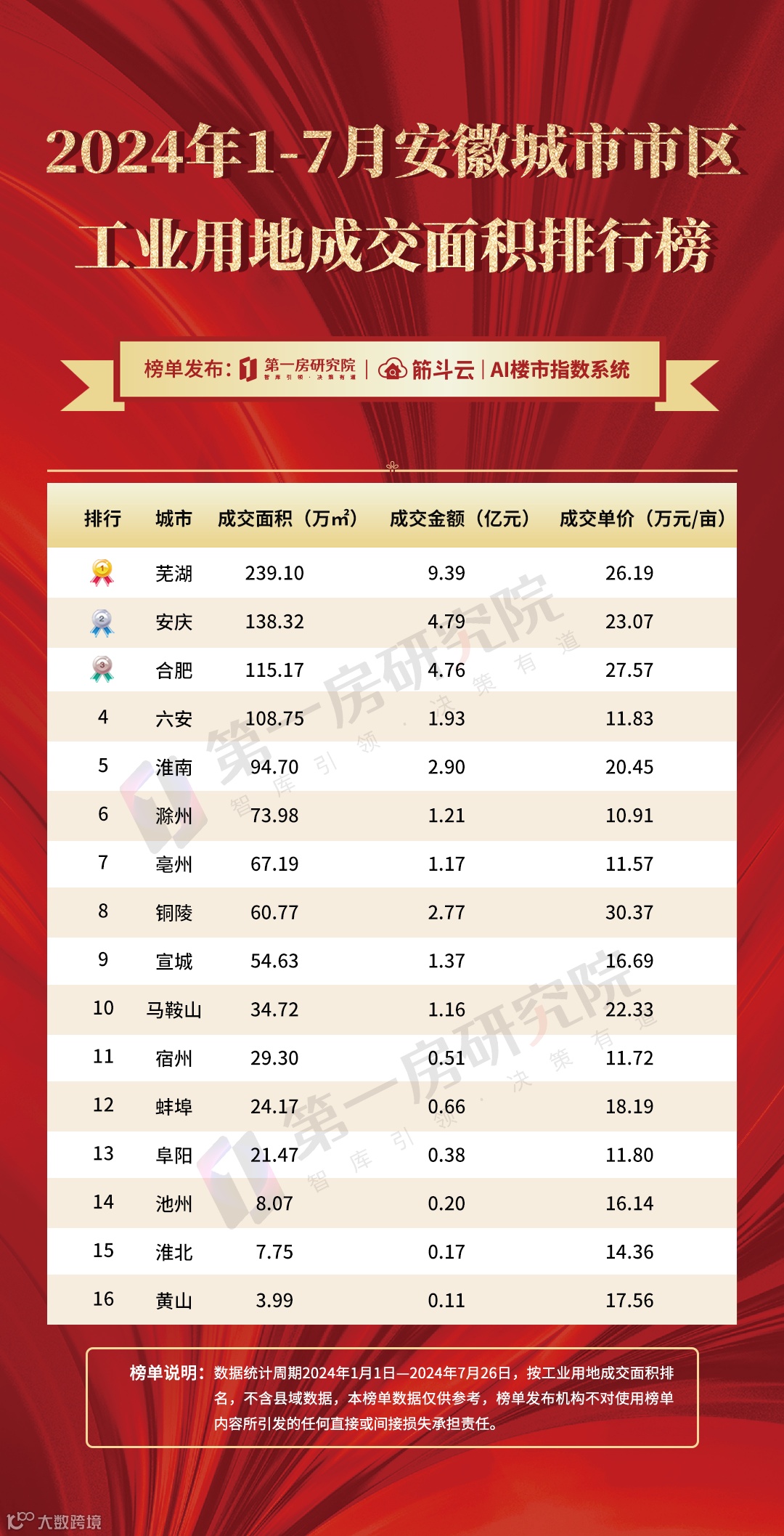 根据第一房研究院AI楼市指数系统统计数据显示,2024年1-7月(截止7月26日,下同)安徽16城市成交面积前三分别是合肥、安庆、宣城,分别成交391.32万方,358.59万方和327.77万方;在成交总价方面合肥、芜湖和安庆排名前三,分别成交12.33亿元、10.56亿元和10.387亿元。而成交单价前三分别是铜陵、芜湖、合肥,分别是26.94万元/亩,21.54万元/亩和21.01万元/亩。