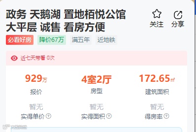 从24小时线内调价房源来看,绝大多数以降价为主,而且有些房源降价幅度也较大。比如政务天鹅湖置地栢悦公馆一套172.65㎡房源,降价67万,挂牌单价约5.38万/㎡。