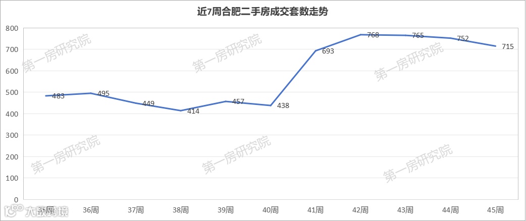 再来看看二手房市场,上周合肥二手房成交了715套房源,环比上周二手房成交量跌了4.9%。整体来看,二手房成交上周虽然小幅下跌,但是整体来看依然保持较高的成交量,已经连续4周成交量保持在700套房源以上。