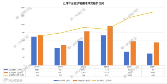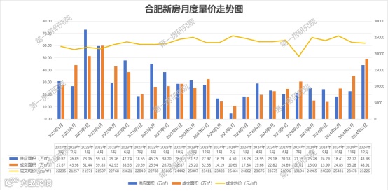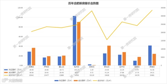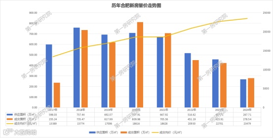根据第一房研究院AI楼市指数系统统计数据显示,2024年合肥新房供应面积267.71万方,同比下跌41.5%;成交面积278.54万方,同比下跌34.3%;成交均价23479元/㎡,同比上涨了3.4%。