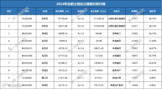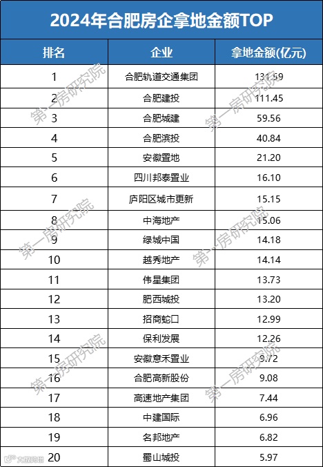 从拿地金额来看,合肥轨道以131.59亿元排名第一,合肥建投以111.45亿元排名第二,合肥城建以59.56亿元排名第三。