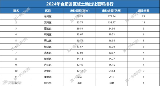 在出让面积方面,排名第三的是肥西县,出让面积53.79万方,出让金额24.56亿元,出让了5宗地块。成交最少的是巢湖和肥东,仅成交1宗地块。