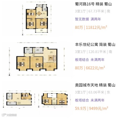 蜀山区的精装奥园城市天地,精装、三室一厅,总价59.9万就可拿下。丰乐世纪公寓简装80万,120m²,三室一厅。