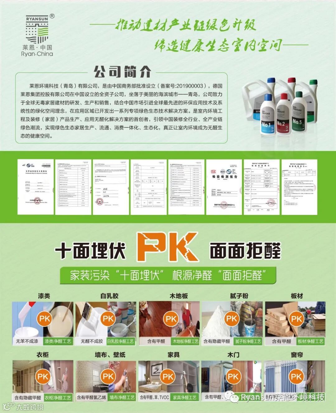 莱恩环境,23年的技术沉淀,可根据不同建材定制生产,专利产品Ryansun®净醛因子,核心成分为活性生物蛋白酶,国内唯一真正从装修中植入,在装修源头质控,在环保材料的基础上将每个环节再加一道工艺质控,彻底解决叠加污染,产品能强效捕捉聚合甲醛,不会产生二次污染,而且还能有效地清除各种污染源异味,从源头上彻底清除有害物质,安全无毒、不改变装修材料,不增加装修成本,保证装完后室内空气质量优于国家标准。真正做到了绿色环保装修,可实现装修完即可入住,彻底摆脱家装污染!