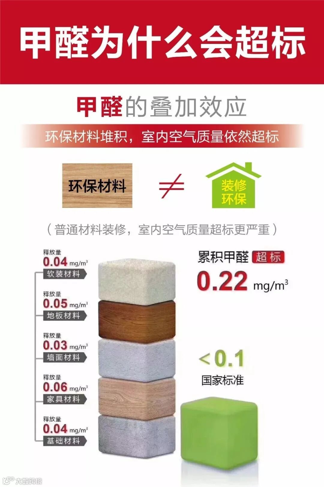 很多装修公司在面对户主时,都是打着环保装修的旗号,但装修完却发现甲醛含量还是超标,究其原因还是因为甲醛的叠加效应,简单来说就是在一套房子里头,业主所购买的所有家具材料、装修材料都是绿色环保的材料。但是我们都知道,没有什么装修建材是可以做到零甲醛的,即便每样材料环保达标,甲醛也确实存在,如果把这些材料聚集在一个地方,等同于汇聚了各材料的一点点甲醛,其释放量形成叠加效应,就会使空气中的甲醛浓度升高,造成室内空气质量不达标。