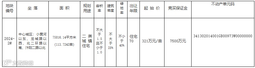 2024-2#地块要求:1、竞买人须为公司法人。2、竞得人须自成交之日起10个工作日内签订项目地块《国有建设用地使用权出让合同》,因竞得人自身原因,逾期未签订的终止供地,竞买保证金不予返还。竞得人注册所在地位于宿州市境外的(属宿州市境内企业,如需在项目所在地辖区内另行注册全资子公司的,须在报名时作出书面申请),须自成交之日起40日内在项目所在地设立一个有法人资格的全资子公司并由其与市自然资源和规划局签订《国有建设用地使用权出让合同变更协议》,竞得人及其全资子公司对宗地出让文件、《国有建设用地使用权出让合同》及《国有建设用地使用权出让合同变更协议》的权利、义务互负连带责任。3、竞买人在办理竞买登记手续时,须书面承诺“已认真阅读该宗地相关出让文件并自愿受其约束,对土地现状充分了解无异议,愿意在约定时间内现状接受土地,签订《国有建设用地交付确认表》,不对宗地现状交付和相关出让文件有异议或提出抗辩”。4、竞买人竞得土地后,须按规划条件通知书、《宿州市控制性详细规划通则》和出让合同约定的容积率进行开发建设,不得擅自改变,未经批准,擅自提高容积率的,超容积率部分无偿收回或按规定补缴土地出让金并作处罚。5、竞得人可以选择分期付款方式支付土地出让金,竞买保证金直接转为首期土地出让金且首期(合同签订之日起1个月内)缴纳比例不低于总价款的50%,1年内缴清全部出让价款。分期支付出让价款的,竞得人在支付第二期及以后各期出让价款时,须按照支付第一期土地出让价款之日中国人民银行公布的
