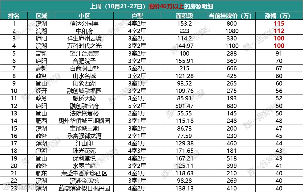 涨价40万以上的房源有23套,主要集中在滨湖、政务、蜀山、庐阳、高新、经开、肥西、肥东,但涨幅高的基本上都在滨湖。其中有4套房源涨价超100万,最高有房源涨幅115万。