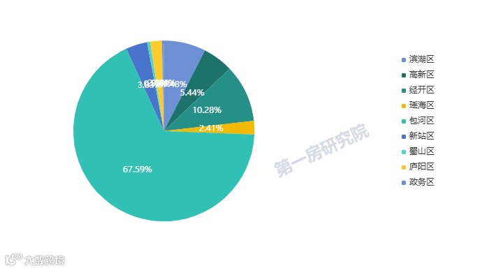分区域来看,包河区成交面积占比67.59%,九区排名第一。经开成交面积占比10.28%,九区排名第二。