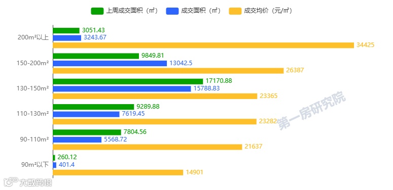 从成交面积段来看,本周成交面积段130-150m²的占比最大。