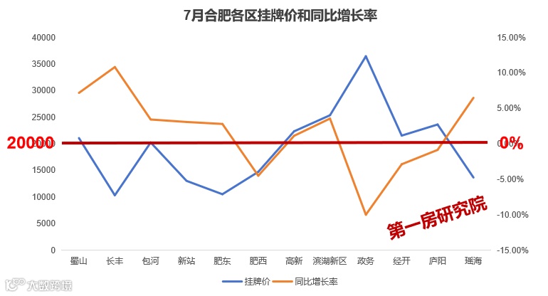挂牌价整体处于下降趋势,分区域来看,从7月的合肥各区县挂牌价,挂牌价最低的长丰县,平均价10290元/m²,九区中最低的是新站区,平均价13003元/m²,挂牌价最高的是政务区,平均36416元/m²。通过同比增长率,可以看出,长丰县、包河区、新站区、肥东县、肥西县、瑶海区挂牌价同比是下降的,蜀山区、高新区、滨湖区、政务区、经开区挂牌价同比上涨。