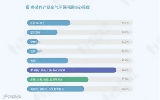 消费者对板材、木质家具最为担忧,高达92.6%,然后依次是床垫沙发等软装、美缝剂等胶水。