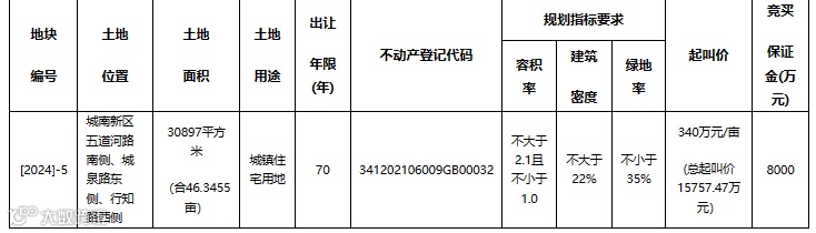 [2024]-5号宗地要求:1.竞买人可以是自然人、法人和其他组织。2.根据城南新区管委会的函,地块内配套的医疗卫生、文体、社区