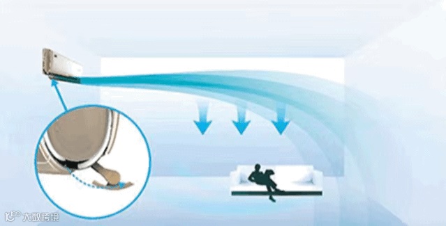制冷时,运动大导风板打开向上,冷风被托起,水平向上吹出,自然下沉,实现“淋浴式制冷”。
