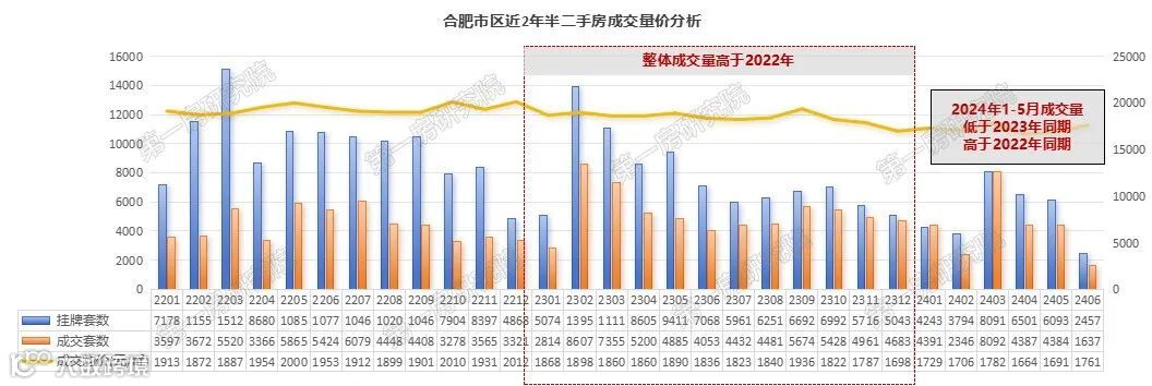 近两年半合肥市区二手房月均新增挂牌量8175套,月均成交量4783套,成交均价为18590元/㎡,低于新房成交价接近3800元/㎡,二手房价格下滑走势明显。分月度看,2023年整体成交量高于2022年,2023年月均比2022年高700套左右。成交均价近一年半下滑1500元/㎡左右。从降价能走量不难看出合肥的购房需求是相对旺盛的。2024年1-5月合肥市区二手房成交量约23600套,低于2023年同期水平但高于2022年同期。这说明2024年,合肥二手房市场仍然保持高热状态。但从2024年6月前20天成交量来看,仅有1637套成交量,成交量下滑超4成,预计到6月底二手房成交量很有可能达不到今年的平均水平。