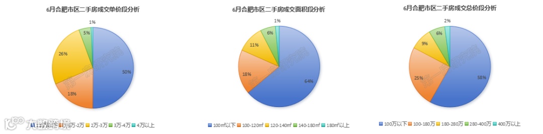 从6月合肥市区二手房成交结构来看,1.6万以下的房源占比接近5成,100㎡以下的房源成交占比超6成,100万以下总价段的房源成交占比接近6成。通过以上数据不难看出,6月合肥二手房依然是以低单价、低总价、小面积的房源为主。二手房市场购房群体以刚需为主,其次是刚改。