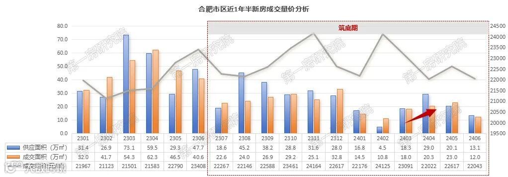 根据第一房研究院AI楼市指数系统统计数据显示,近一年半合肥市区新房月均供应量31.1万㎡,月均成交量29.8万㎡,成交均价为22385元/㎡。分月度看,从2023年6月开始,市场长期处于筑底期。成交均价方面,近一年半稳中有涨。由此可见,新房市场的购房群体更倾向于选择高能级板块的高价格产品,同时在放开限价后,市场价格有明显上升趋势。从2023年12月开始至2024年2月份,合肥市区新房市场已经连续2个月下跌,2-5月份市场连续4个月上涨,6月份截止20号的成交量在12万方预计到月底至少成交量能达到4月份的水平。