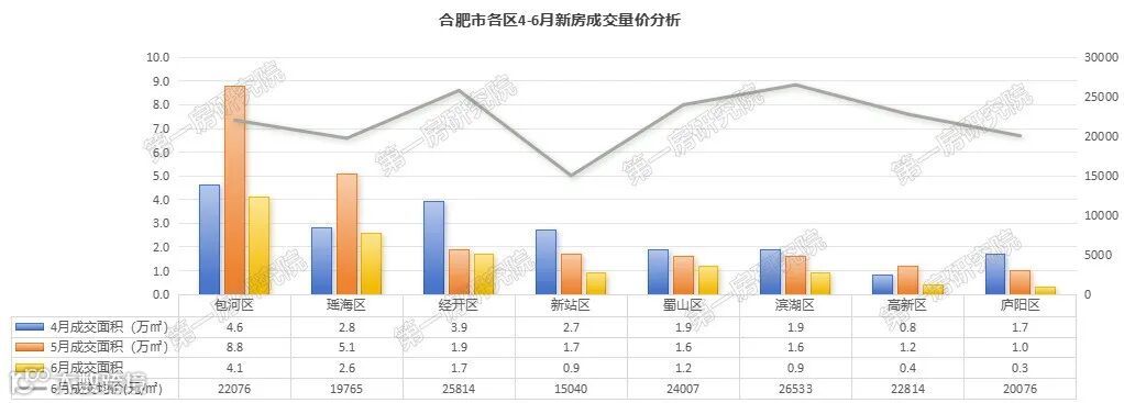 从4-6月各区新房成交来看,除政务区之外的八个区域中,包河、瑶海、经开为成交主力。新站、蜀山、滨湖成交量几乎持平。高新、庐阳受在售项目较少原因的影响成交量排名靠后。包河区6月贡献最大的主要是招商雍润府、万科城改朗拾森屿、保利海上瑧悦等楼盘,主力基本上都是淝河板块的项目。瑶海区贡献最大的是四川邦泰东方雅颂、伟星宸ONE等项目,分别位于东部新中心板块和瑶海老城区。经开区贡献最大的是龙湖亚伦央璟颂、建发华润翡翠云璟和皖投云启锦上等项目。