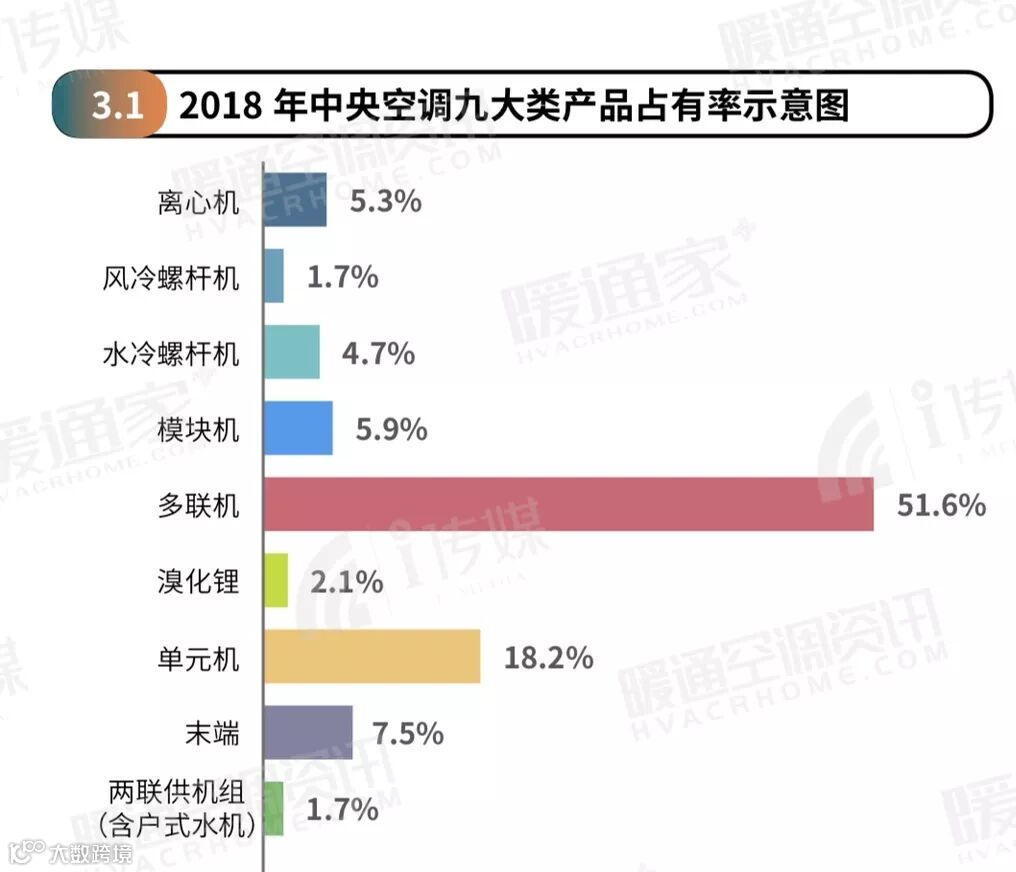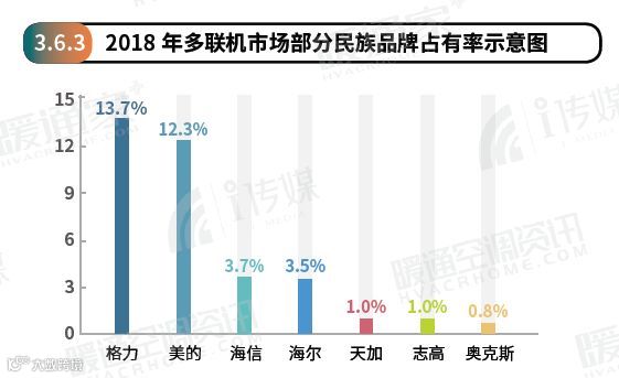据《中央空调报告》统计数据显示,2018年行业最热销品类依旧是多联机,占比51.6%。格力以13.7%的市场占有率再次摘下多联机品类民族品牌占有率第一的桂冠。