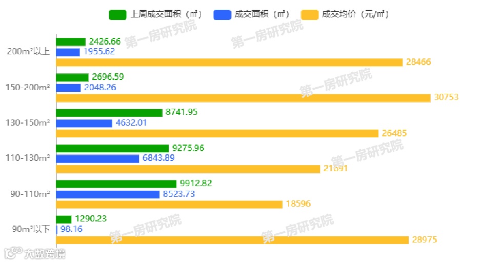 从成交面积段来看,本周成交面积段90-110m²的占比最大。