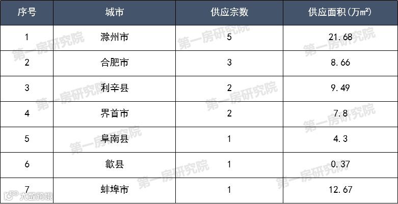 本周安徽省16地市中涉宅用地挂地城市较多,共7个市县挂地,挂地宗数15宗,总面积64.97万m²。