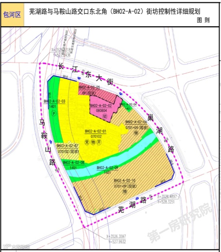 本街坊位于包河区芜湖路与马鞍山路交口东北角。规划范围东至巢湖路,南至芜湖路,西至马鞍山路,北至长江东大街。总面积13.94公顷(约209.1亩)。其中BH02-A-02-01地块为二类城镇住宅用地,容积率不大于1.8,建筑密度不大于25%,绿地率不小于40%:BH02-A-02-02地块为幼儿园用地,容积率不大于1.0,建筑密度不大于35%,绿地率不小于35%;公园绿地绿地率不小于65%。其他地块为现状保留。