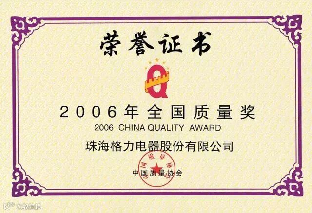 早在2001年9月,格力电器就凭借扎实的产品品质荣获国家质量监督检验检疫总局授予的“中国名牌产品证书”;2006年11月,荣获中国质量领域的顶级荣誉——“全国质量奖”;2007年7月,被国家人事部、国家质检总局联合授予“全国质量工作先进集体”称号,是家电行业唯一获此殊荣的企业……