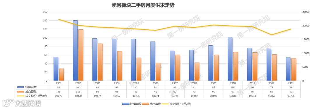据第一房研究院Ai楼市指数系统显示,二手房方面,淝河板块近13个月,月均挂牌量85套,成交量62套,成交均价19163元/㎡。目前板块内“倒挂楼盘”很少,仅品质较高的翡翠天际二手房挂牌价3.5万/㎡,与新房差价约1万/㎡。