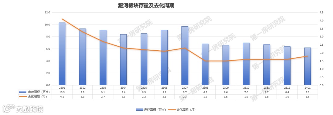 库存方面,淝河板块近13个显性库存量维持在8万㎡左右,平均去化周期2.2个月。2023年1月开始,板块库存及去化周期呈现平稳下滑的趋势,整体市场基本面表现十分健康。