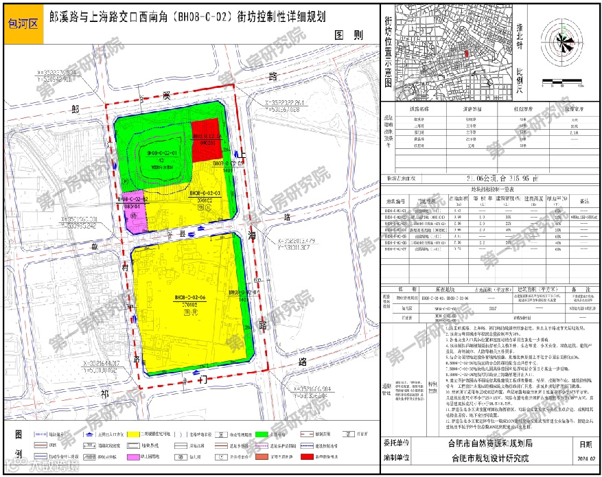 该街坊规划范围东至上海路、南至祁门路、西至江村路、北至郎溪路。总面积21.06公顷(约316亩)。其中BH08-C-02-02地块为幼儿园用地,容积率不大于1.0,建筑密度不大于35%,绿地率不小于35%;BH08-C-02-03地块为二类城镇住宅用地,容积率不大于2.0,建筑密度不大于22%,绿地率不小于40%;BH08-C-02-04地块为新型商务用地,容积率不大于2.0,建筑密度不大于40%,绿地率不小于20%;BH08-C-02-06地块为二类城镇住宅用地,容积率不大于2.2,建筑密度不大于20%,绿地率不小于40%;公园绿地绿地率不小于65%;该街坊控规东侧紧邻“淝河新中心”,区位上有一定优势。