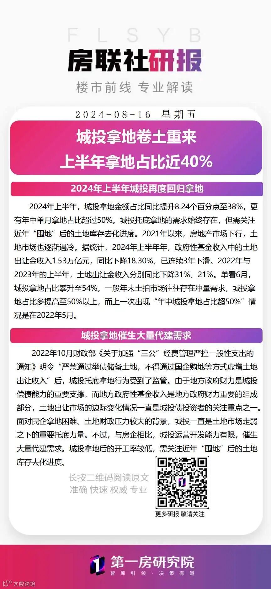 导读:城投拿地卷土重来,上半年拿地占比近40%