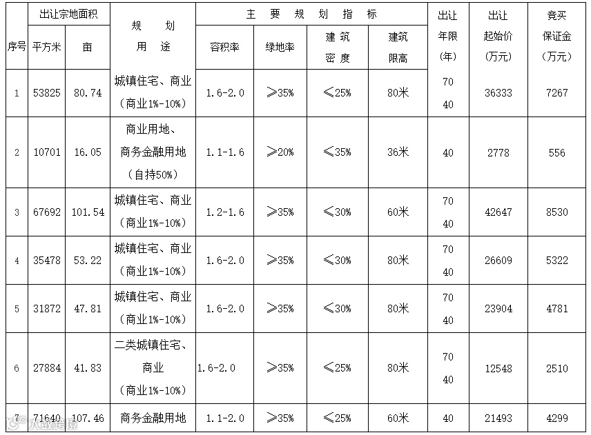 具体情况见下表(宗地详细规划指标及要求请见出让文件)