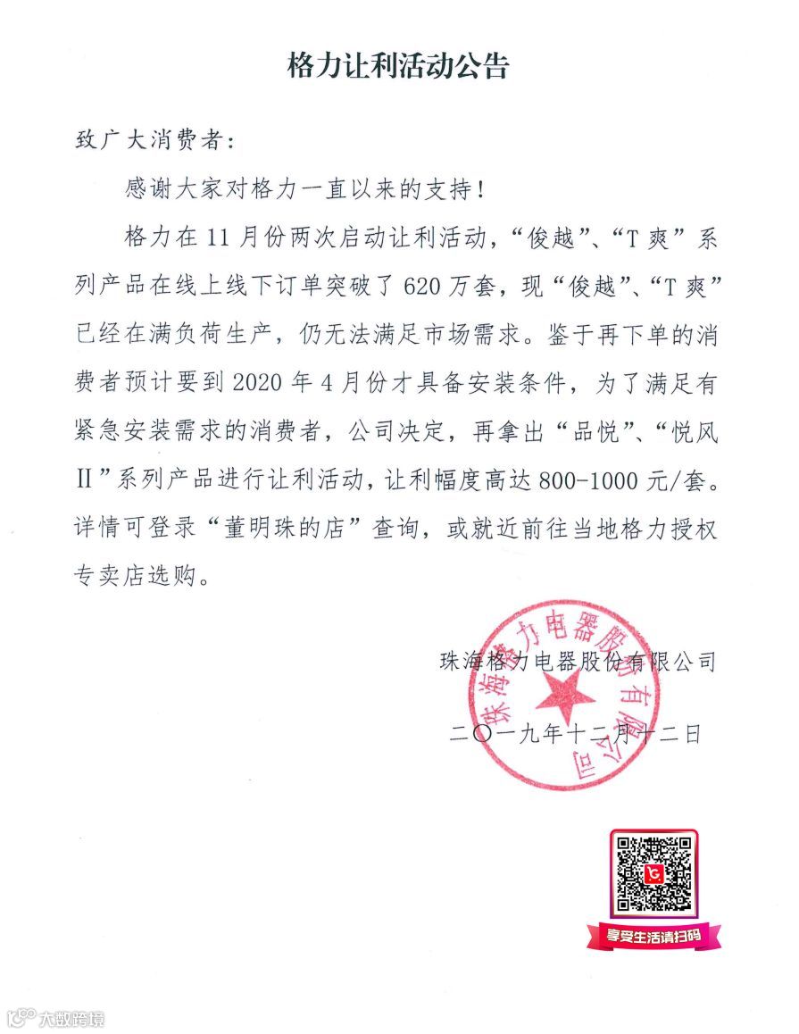 格力在11月份两次启动让利活动,“俊越”、“T爽”系列产品在线上线下订单突破了620万套,现“俊越”、“T爽”已经在满负荷生产,仍无法满足市场需求。鉴于再下单的消费者预计要到2020年4月份才具备安装条件,为了满足有紧急安装需求的消费者,公司决定,再拿出“品悦”、“悦风Ⅱ”系列产品进行让利活动,让利幅度高达800-1000元/套。详情可登录“董明珠的店”查询,或就近前往当地格力授权专卖店选购。