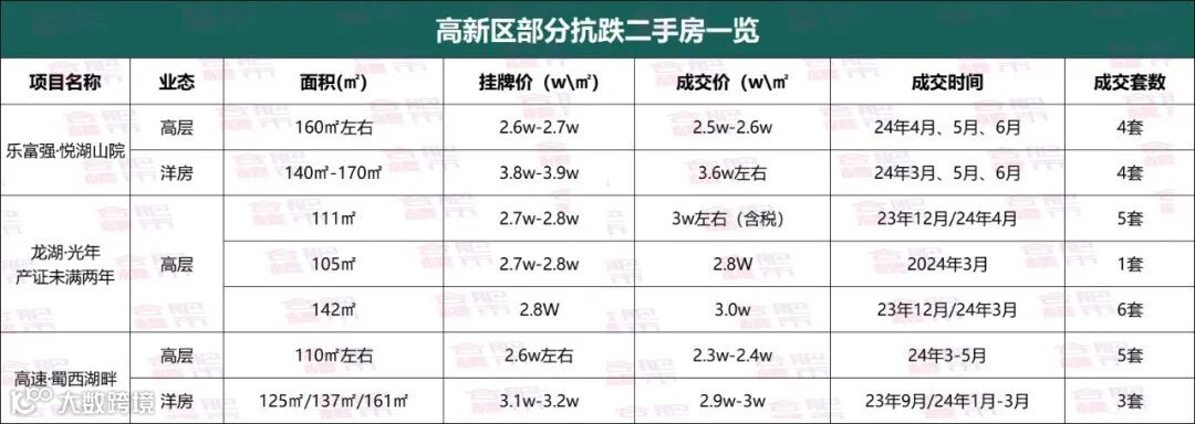 高新区的悦湖山院,地处蜀西湖东侧,近期成交的160㎡左右高层,挂牌单价2.6-2.7万/㎡,成交均价则在2.5-2.6万/㎡;洋房则以140-170㎡洋房为主,今年成交的几套,均价都在3.6万/㎡左右。