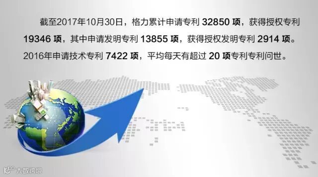 数据显示,截至2017年10月30日,格力累计申请专利32850项,获得授权专利19346项。拥有18项“国际领先”成果。