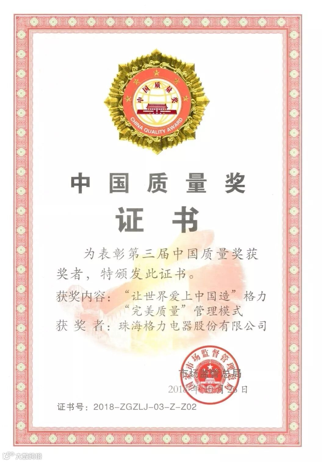 2018年,格力凭借“让世界爱上中国造”完美质量管理模式,荣膺第三届中国质量奖,成为当届唯一获此殊荣的家电企业。中国质量奖由国务院批准设立,国家质检总局负责组织实施,每两年评选一次,是中国质量领域的最高荣誉。