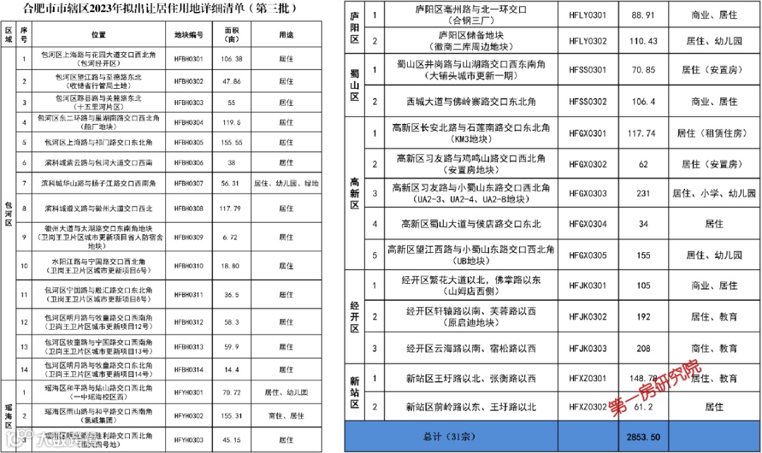 公共资源土地市场网发布了合肥市市辖区2023年第三批居住用地拟出让详细清单。经统计,本次公布的地块明细中包括包河11宗、高新区5宗、滨湖、瑶海、经开各3宗,庐阳、新站各2宗,共计31宗,2853.5亩。其中普通商品房住宅地块共计28宗,供地面积2602.91亩。