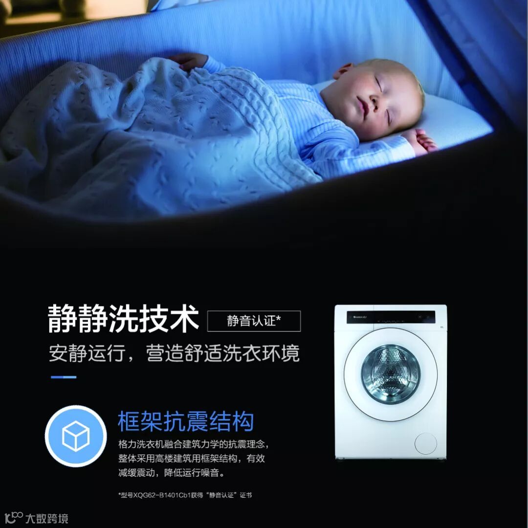 BLDC变频直流电机,加上格力特有的框架式防震结构,有效减小震动,降低噪音,噪音低至49分贝,荣获国家静音认证,让您在洗衣过程中静享舒适。