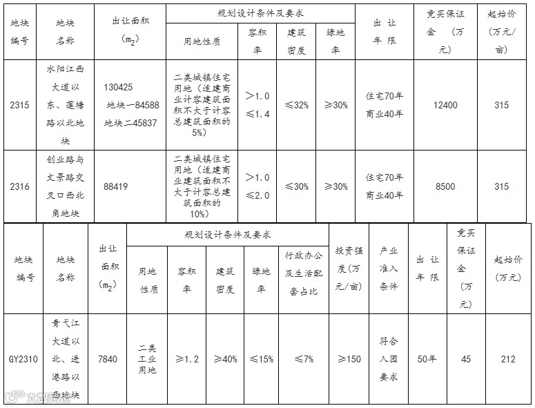 本次公开出让的地块均设有底价,采用增价方式,2315号、2316号地块增加幅度为1万元整数倍/亩·次,GY2310号地块增加幅度为1万元整数倍/次。按价高者得的原则确定竞得人。