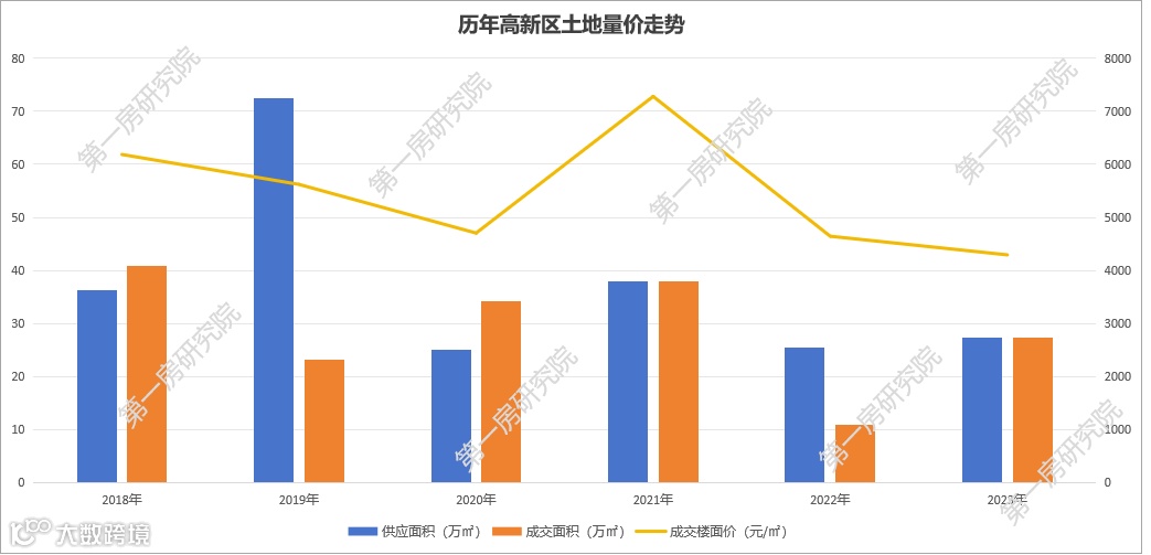 近几年高新区整体土地供应量较少,近6年年均供应量37万方,年均成交量29万方。