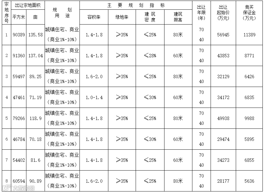 具体情况见下表(宗地详细规划指标及要求请见出让文件)