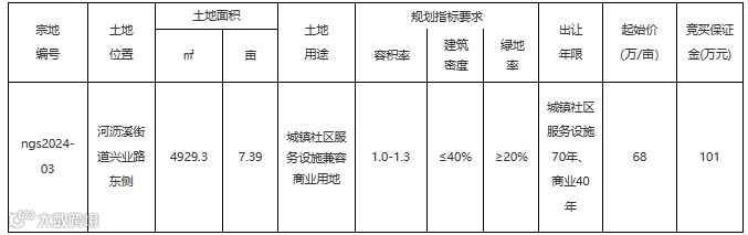 ngs2024-03号地块位于河沥溪街道兴业路东侧,出让面积4929.3平方米,不动产单元号:341881002080GB00122W00000000。该地块的建设要求需严格按照宗地规划设计条件执行(详见出让文本)。