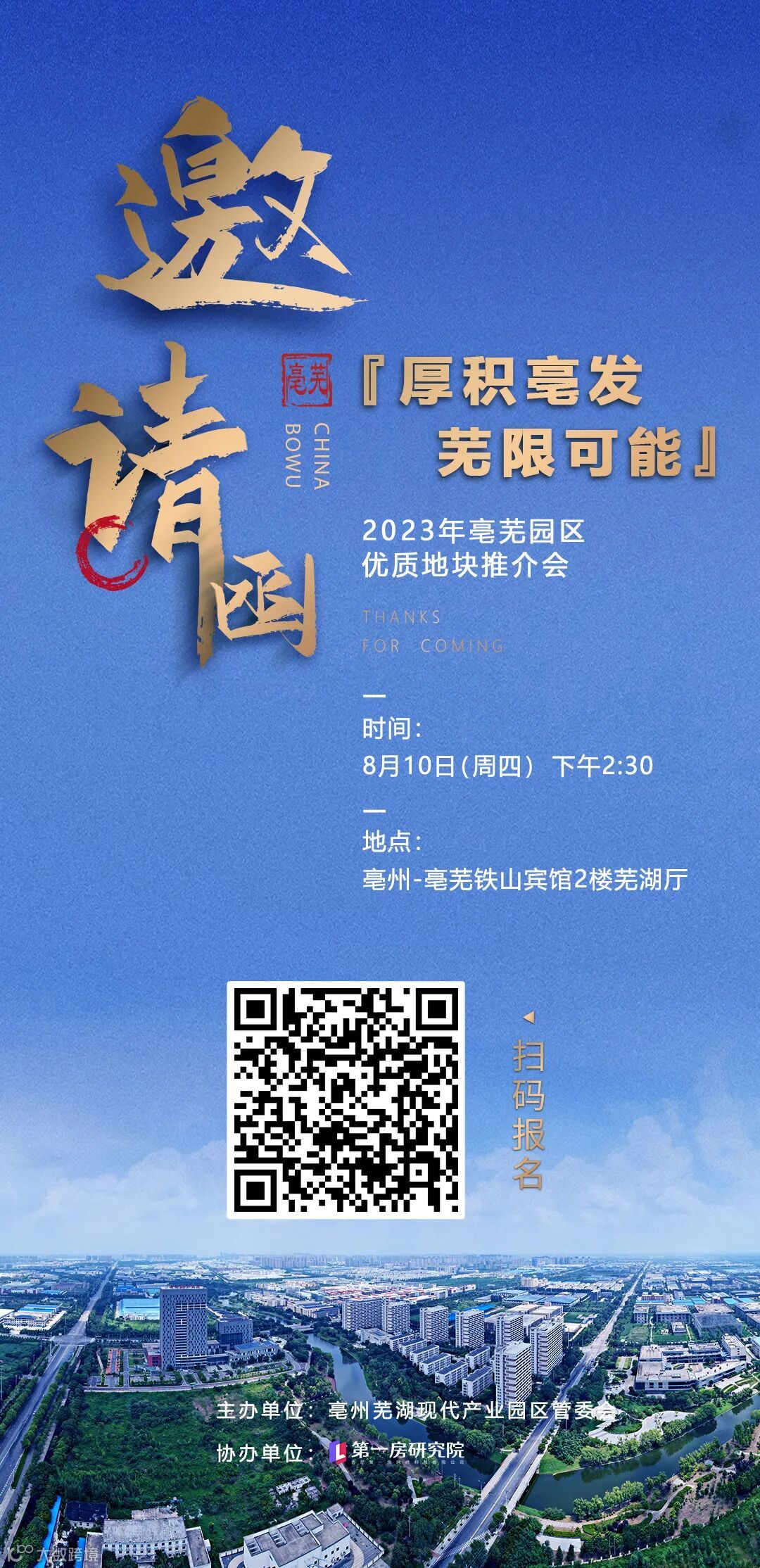 为大力推进城市化进程、加大招商引资力度、精心打造长三角一体化的战略决策。由亳芜现代产业园区管委会主办,第一房研究院协办的“厚积亳发 芜限可能——2023年亳芜园区优质地块推介会”兹定于2023年8月10日(周四)下午2:30,在亳芜铁山宾馆2楼芜湖厅隆重举办。本次会议将推出土地5宗,占地面积约491亩,敬请期待...