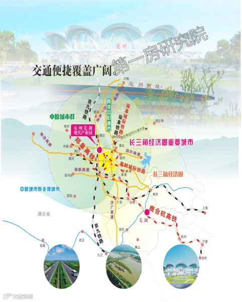 亳州是中部崛起和长三角区域一体化发展、双层国家战略叠加区域,亳芜园区紧邻亳州高铁南站,坐拥城南高铁商圈,一个半小时直达合肥、郑州,两个半小时直达南京、芜湖,三个半小时直达上海、西安,四小时可达北京、杭州。京九高铁、规划中的亳蚌滁城际铁路穿境而过,济广、宁洛、盐洛和济祁高速构成“井”字型路网,311、105国道和6条省道在此交叉,涡河、茨淮新河, 通江达海。与建设中的亳州机场相距仅20公里,水陆空立体交通格局正在形成。