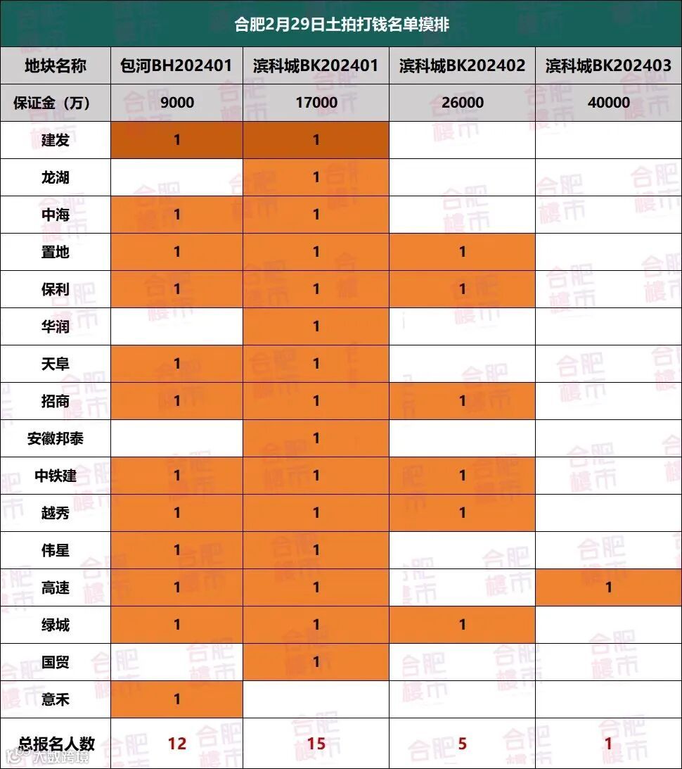 今天下午,合肥2月29日土拍打钱名单曝光,包河12家,滨湖15家,共有16家房企参与此次土拍大战。